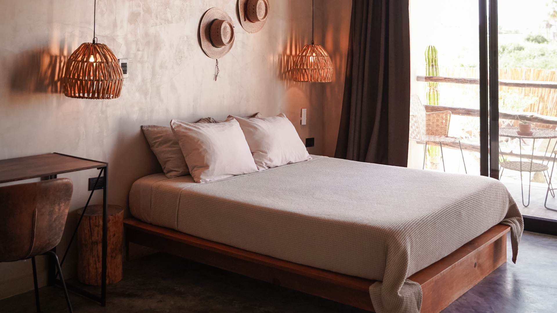 The bed is super inviting with soft sheets and lots of pillows, perfect for a good night’s sleep. Now, let’s talk about the view – open those curtains, you’ve got a sweet cactus garden scene right outside your window.